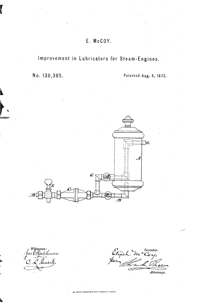 - “The Real McCoy”: The superior quality of McCoy’s inventions was well-known in the industry. As with his other patents, this lubricator was far more effective than the many knockoffs on the market. This reputation for excellence is widely believed to be the origin of the popular phrase “The Real McCoy.”
