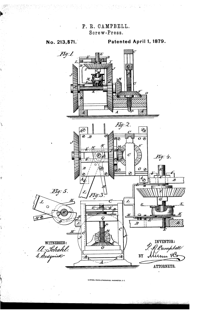 The patent by Peter R. Campbell of Hurricane, Mississippi, describes an Improvement in Screw-Presses (Patent No. 213,371, 1879). The object is to furnish an improved screw-press that can be operated by steam, horse-power, or other external power, while being simple in construction, easily adjusted and controlled, and reliable in operation.