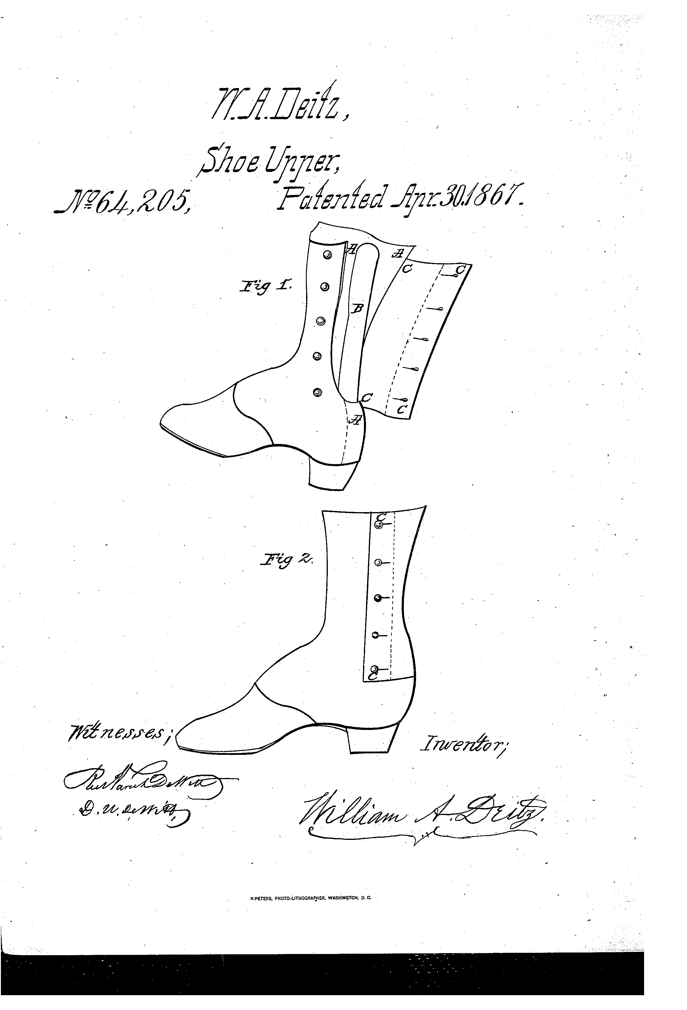 Improvements in Shoes – William A Dietz – 1867 – Patent: US64205A