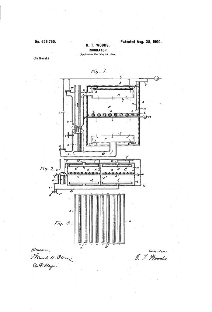 The patent by Granville T. Woods of New York, N.Y., describes certain new and useful Improvements in Incubators or Egg-Hatching Machines (Patent No. 656,760, 1900). The primary objects are to achieve precise ventilation (maintaining air humidity similar to the outside atmosphere), maintain a practically even temperature throughout the entire hatching chamber, and ensure the heated air has a slow, positive downward movement toward the eggs.
