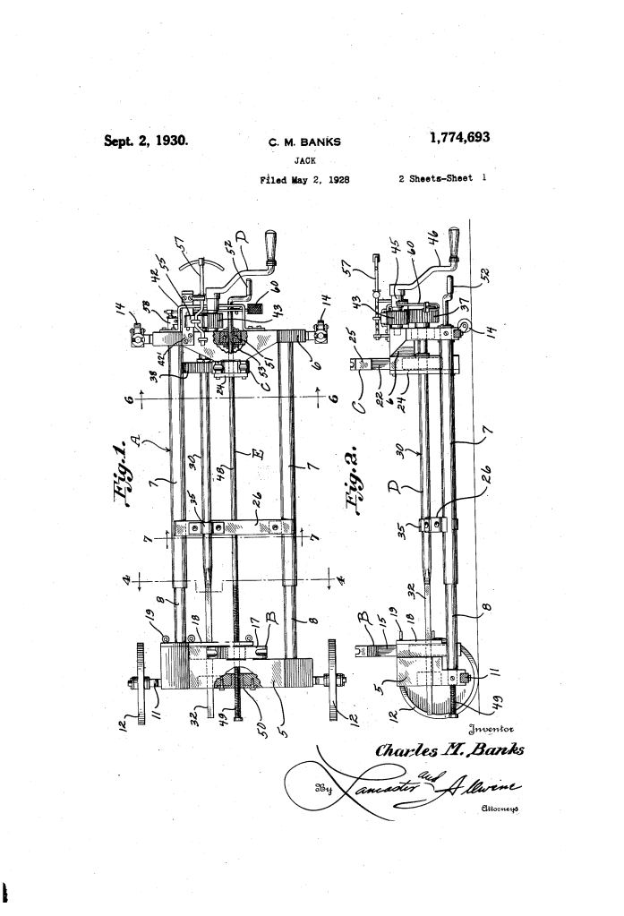Charles M. Banks’ 1930 patent represents a bridge between simple mechanical lifting and modern hydraulic shop lifts.