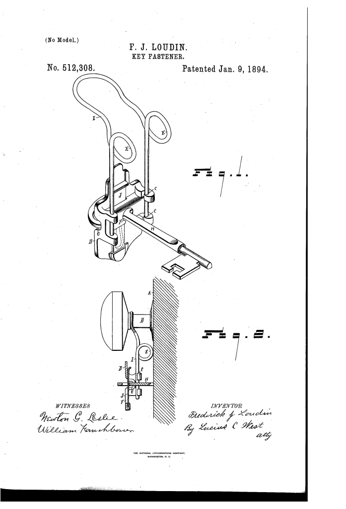 This patent, Key-Fastener No. 512,308 (1894), is another invention by Fredrick J. Loudin, the prominent African-American inventor, singer, and entrepreneur previously noted for his sash-fastener patent.