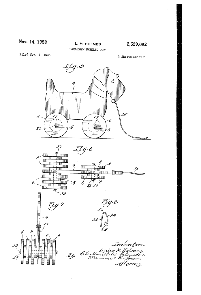 - Wheels (6) and Spacers (8): The toy can be customized. For example, Fig. 6 shows a dog with two front wheels and six rear wheels separated by spacers. This wide rear wheelbase makes the toy exceptionally stable so it won’t tip over when pulled.