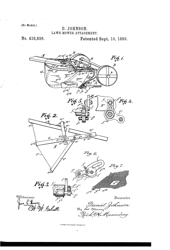 Daniel Johnson’s patent for a lawn-mower attachment is an excellent example of a minor but practical invention that addressed a common need in late 19th-century society.