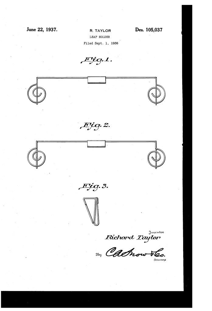 The patent by Richard Taylor of Chicago, Illinois, describes an Ornamental Design for a Leaf Holder (Design Patent No. 105,037), filed in 1936 and granted in 1937. This invention is a specialized stationery or botanical accessory designed to secure loose leaves—either botanical specimens or paper sheets—within a structured, aesthetically pleasing frame.