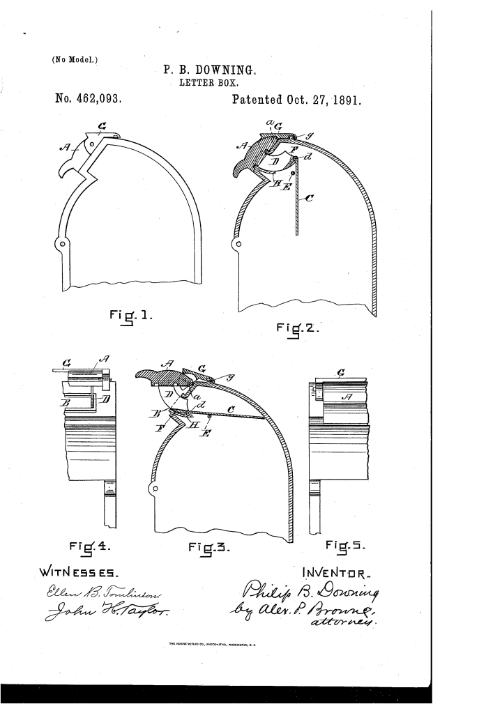 P. B. DOWNING’S letterbox patent (No. 462,093) from October 27, 1891, describes an improved lid for a public mailbox. The invention focused on creating a safer and more secure mailing slot that prevented theft and protected mail from weather. The lid had a hinged cover that, when opened, caused a pivoted guard plate to move into a horizontal position. This created a shelf for the letter to rest on while simultaneously blocking the slot. A subsequent action, such as releasing the lid, would cause the plate to drop, allowing the letter to fall into the box. The design also included a weather strip and storm rib to prevent rain or snow from entering the box.