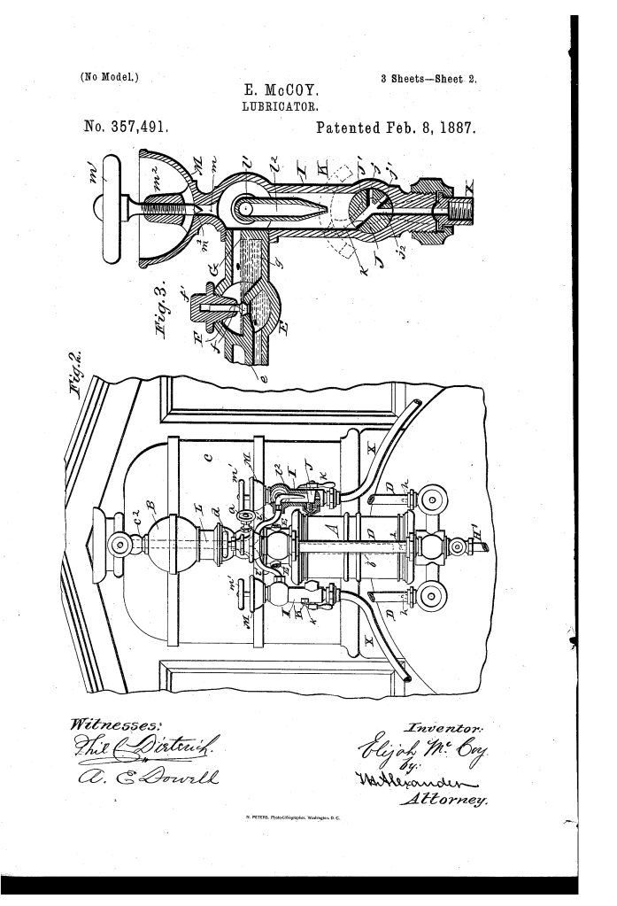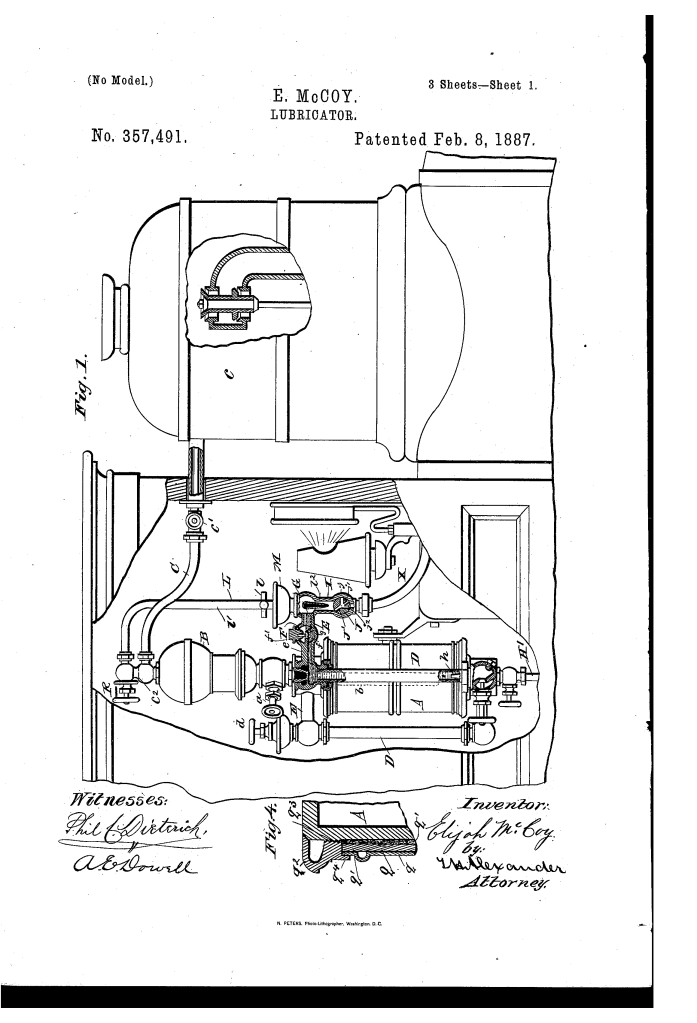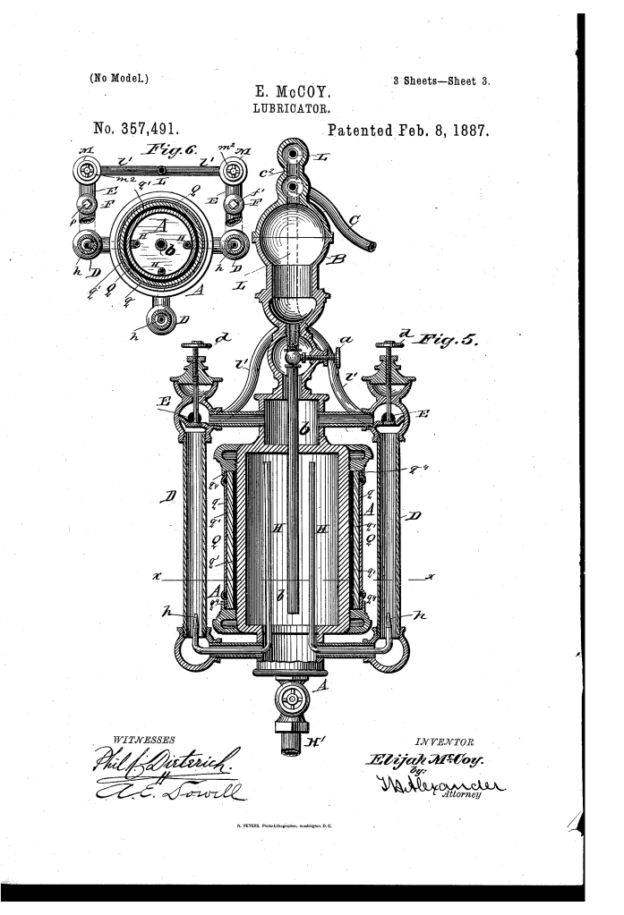 Elijah McCoy was granted U.S. Patent 357,491 for a “Lubricator” on February 8, 1887. This invention was an extremely advanced and refined lubricator system, particularly designed for locomotives. It was an improvement upon a previous patent he had filed with Clarence B. Hodges. The primary goal was to address a range of issues related to lubrication, including a more consistent feed, preventing clogging, and protecting the device from environmental factors.