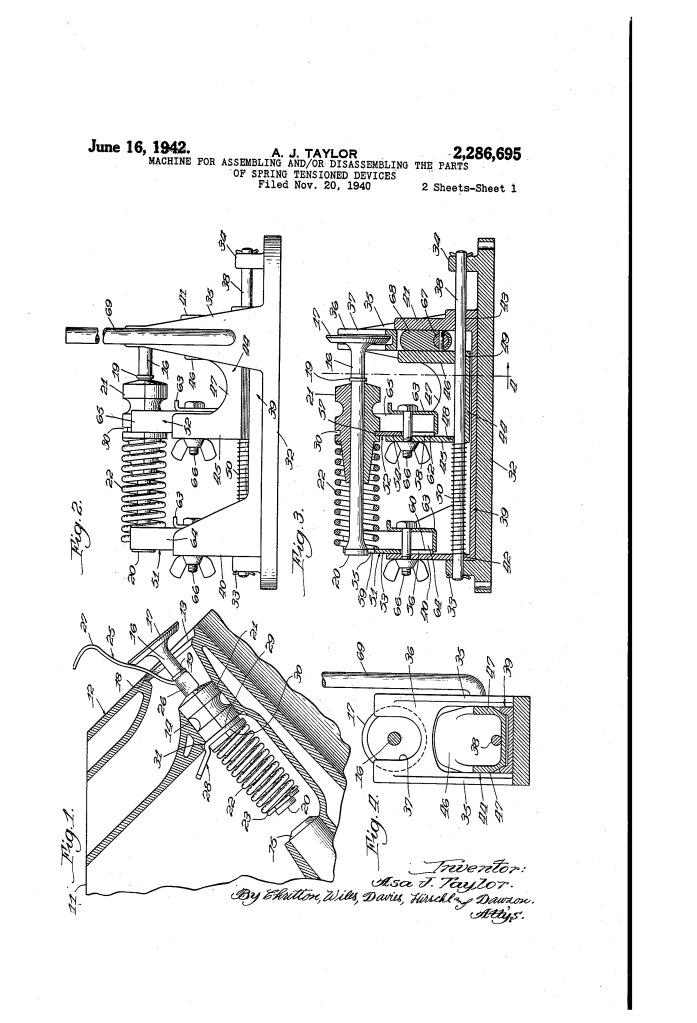 Machine for Assembling and Disassembling Spring Tensioned Devices, Asa J. Taylor, Patent No. 2,286,242
