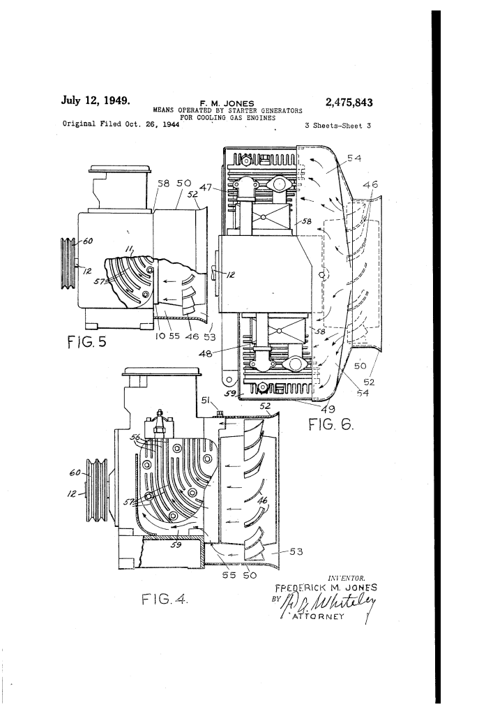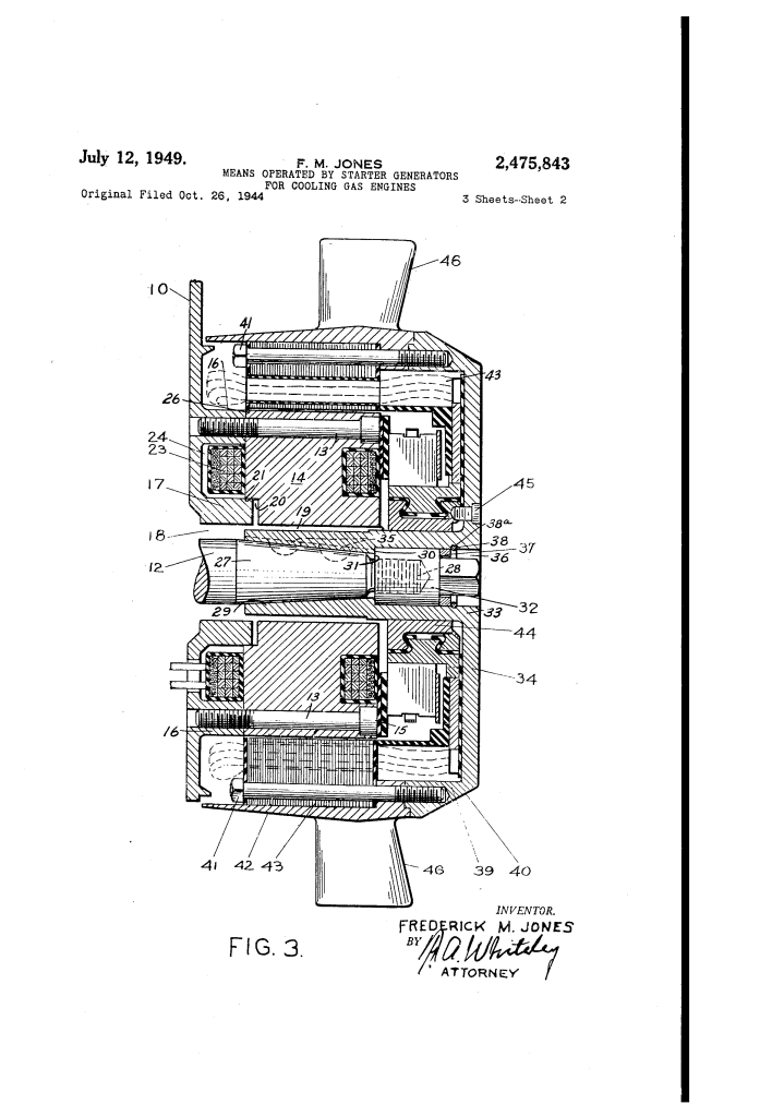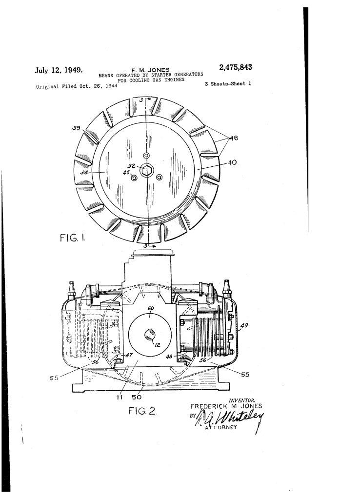 Patented in July 1949, this invention by Frederick M. Jones (U.S. Patent No. 2,475,843) is a strategic mechanical refinement of his “inside-out” starter generator. While the previous patent focused on the electrical architecture of the motor, this patent focuses specifically on thermal management—how to use that spinning motor to keep an air-cooled gas engine from melting down under heavy loads.
