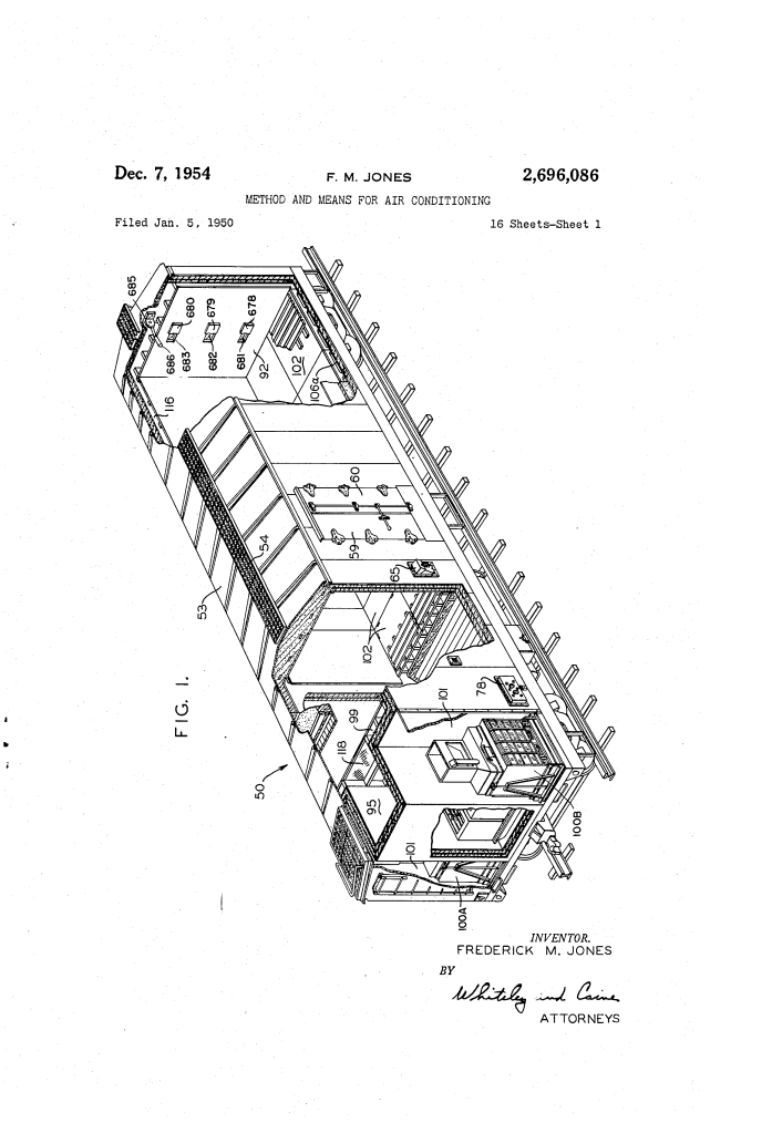Patented on December 7, 1954 (U.S. Patent No. 2,696,086), this invention by Frederick McKinley Jones is widely considered one of the most significant advancements in the history of global logistics. While Jones had previously patented portable cooling units for trucks, this 16-sheet, 32-claim patent provided the blueprint for the modern mechanical refrigerator car (reefer) for railroads.