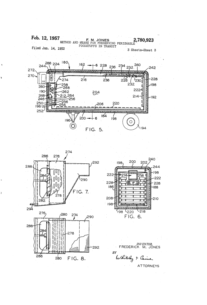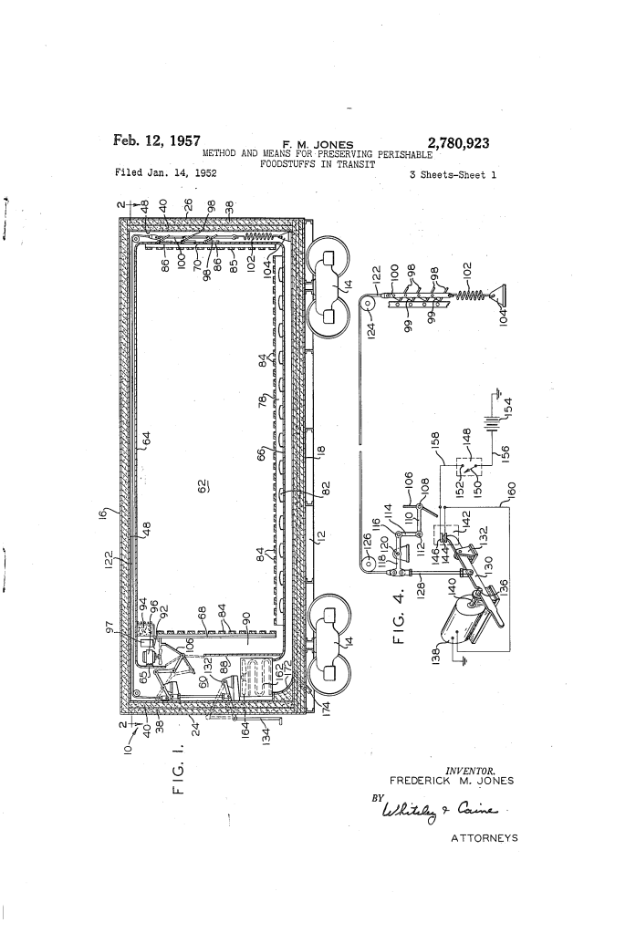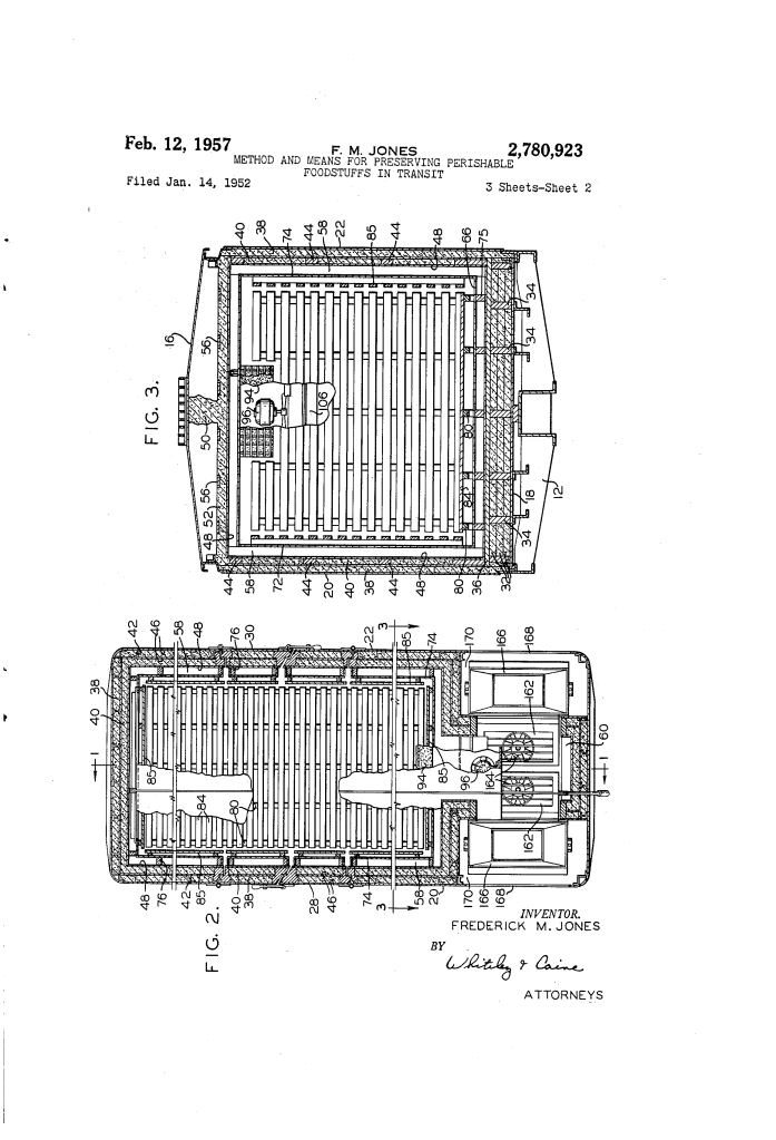 U.S. Patent No. 2,780,923, granted on February 12, 1957, to Frederick M. Jones, describes a sophisticated refrigeration method and apparatus designed to protect fresh produce during long-distance transportation. Frederick Jones, the co-founder of Thermo King and a prolific self-taught engineer, was the dominant figure in the development of mobile refrigeration.