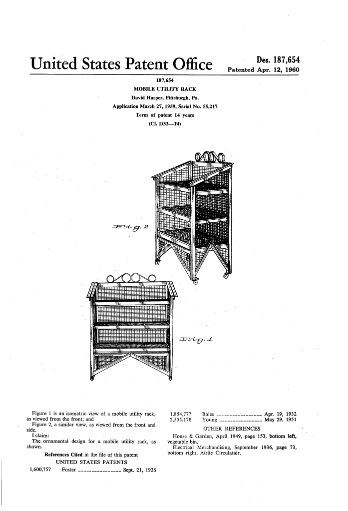 U.S. Design Patent No. D187,654, granted on April 12, 1960, to David Harper of Pittsburgh, Pennsylvania, protects the “ornamental design” of a mobile utility rack. Unlike the previous functional patents discussed, this is a Design Patent, which focuses exclusively on the unique visual appearance and aesthetic form of an object rather than its internal mechanical workings.