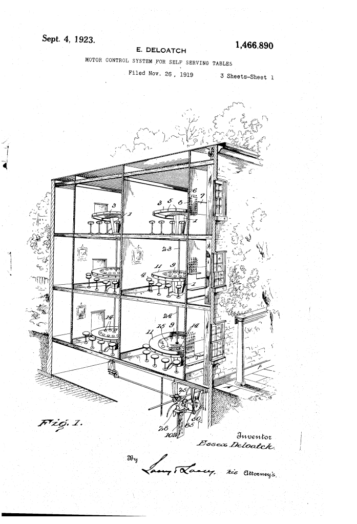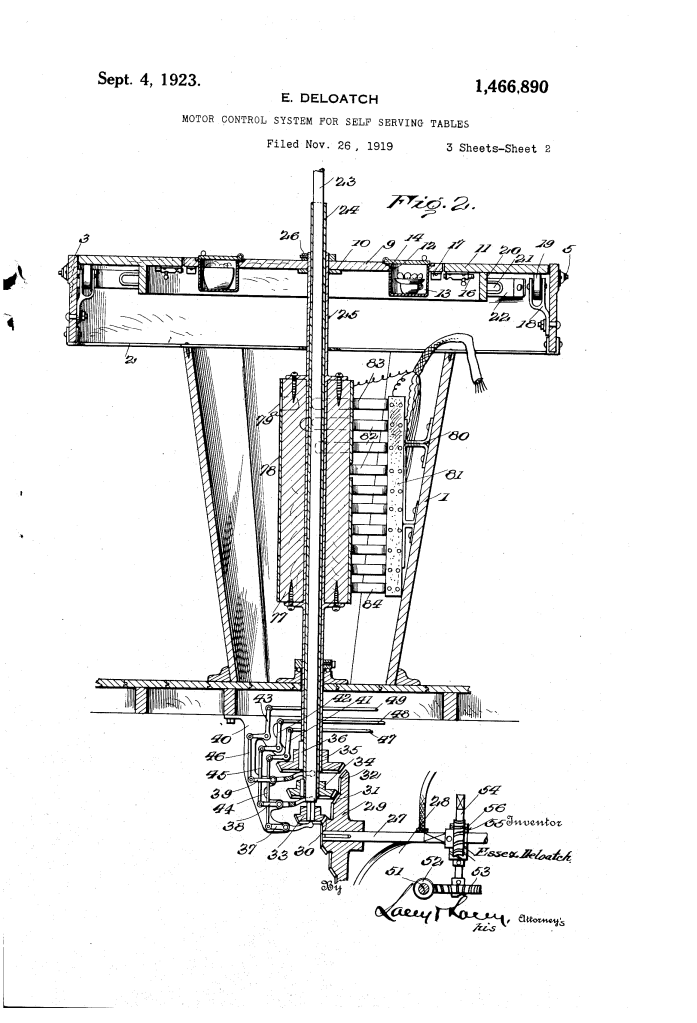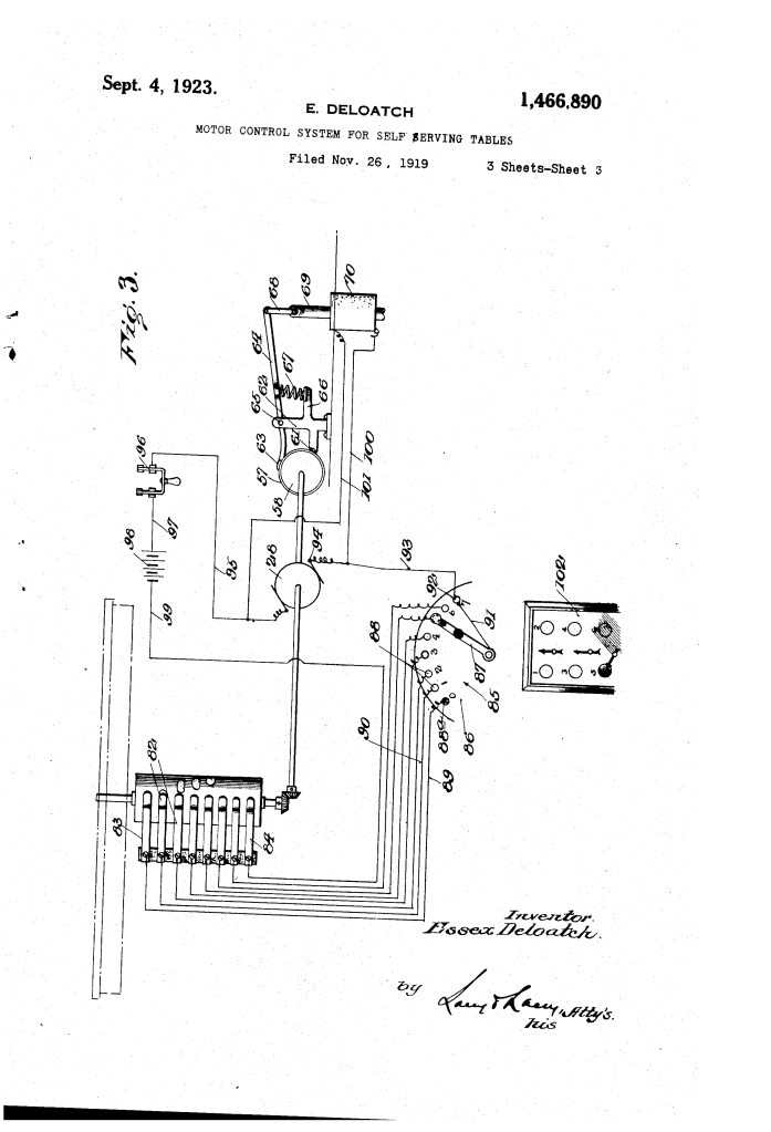 The patent by Essex DeLoatch of Philadelphia, Pennsylvania, describes a Motor-Control System for Self-Serving Tables (Patent No. 1,466,890, 1923). This invention is an automated dining system designed for high-efficiency food service in lunchrooms or restaurants. DeLoatch’s primary objective was to allow a large number of patrons to be served expeditiously from a central kitchen without the need for waiters, utilizing a rotating table system controlled by a remote operator.