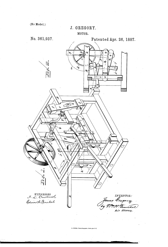 The patent by James Gregory of Bogansville, South Carolina, describes a Mechanical Motor (Patent No. 361,937, 1887). The invention is a human-powered machine designed to drive various kinds of machinery. It utilizes a sophisticated system of levers and a balanced beam to convert manual, vertical motion into continuous rotary power, specifically aimed at rural districts where steam or horse-power might be unavailable.