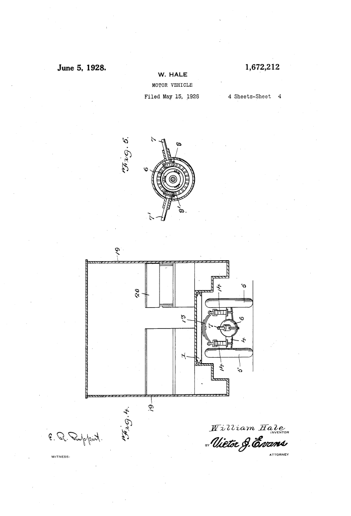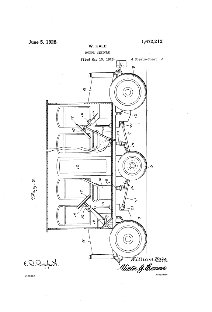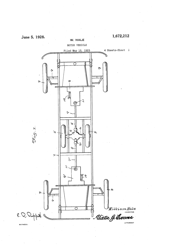 The patent by William Hale of Itmann, West Virginia, describes an innovative Motor Vehicle design (Patent No. 1,672,212, 1928). This invention is a “double-ended” vehicle—specifically designed for motor busses and trucks—that can be operated with equal efficiency from either end. Hale’s primary objective was to eliminate the logistical problem of turning large vehicles around on narrow or rough roads. His innovation features a centralized drive axle powered by two independent motors and a dual-steering system that can be locked in neutral when not in use.