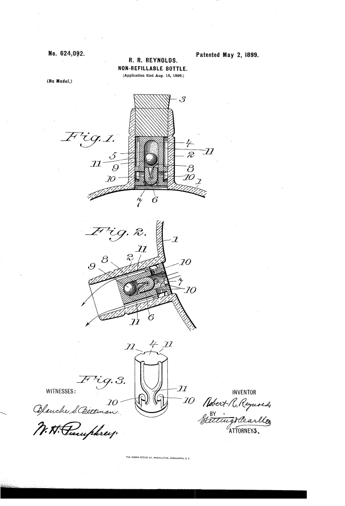 The patent by Robert Randolph Reynolds of New York, N.Y., describes a Non-Refillable Bottle (Patent No. 624,092, 1899). The invention consists of a valved stopper adapted to be permanently applied to prevent unauthorized use and misrepresentation (i.e., refilling with counterfeit liquid).