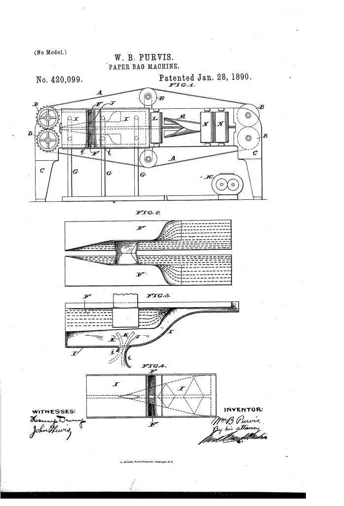 The patent, US420099A, granted to William B. Purvis of Philadelphia, Pennsylvania, on January 28, 1890, is for an improvement in paper-bag machines. The invention focuses on a more efficient way to form the bottom of a paper bag using suction devices.