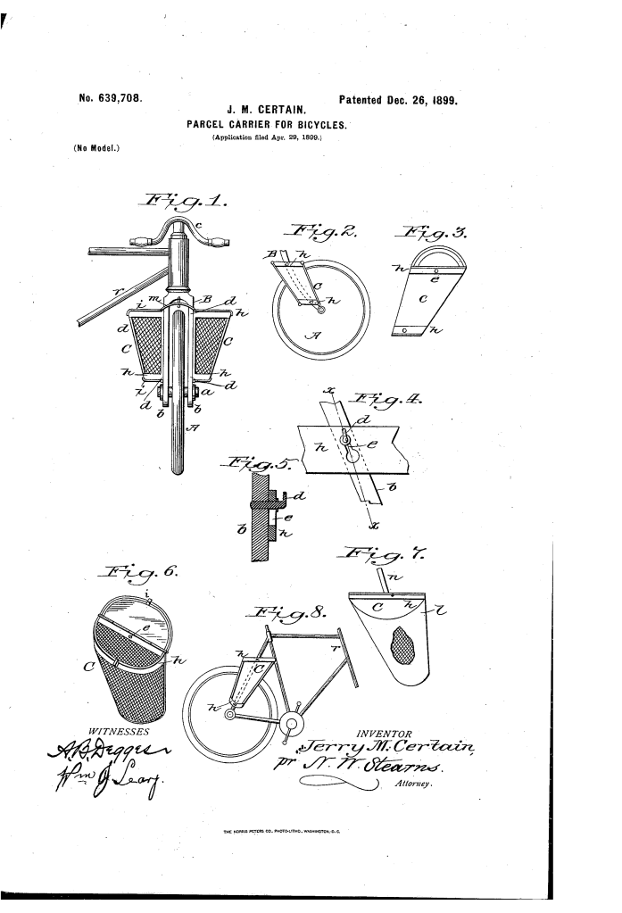 The patent by Jerry M. Certain of Tampa, Florida, describes improvements in a Bicycle Parcel-Carrier (Patent No. 639,708, 1899). The invention consists of a pair of symmetrically-formed basket receptacles located on opposite sides of a bicycle’s forked wheel bar (either front or rear) and a simple means of attaching and detaching them.