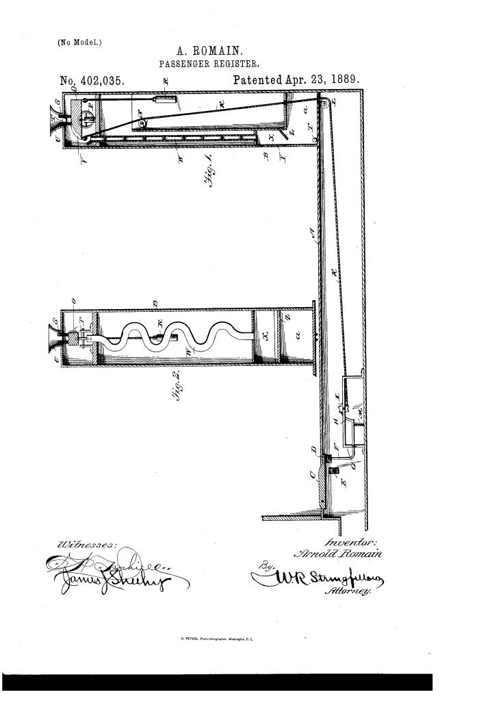 The patent, US402035A, granted to Arnold Romain of New Orleans, Louisiana, on April 23, 1889, is for an “automatic” passenger or fare-register. The invention is a mechanical system designed to count the number of passengers entering and exiting a vehicle, such as a streetcar, without requiring a conductor to manually operate the device.