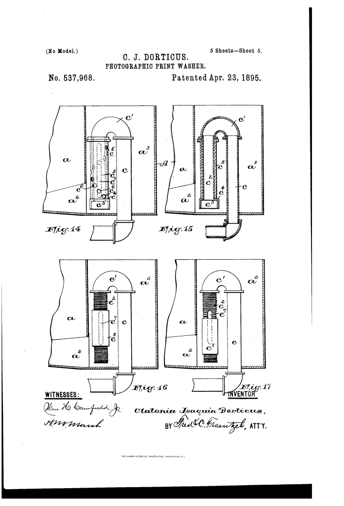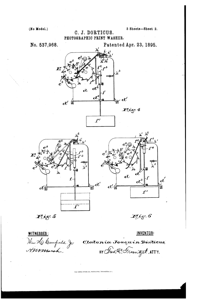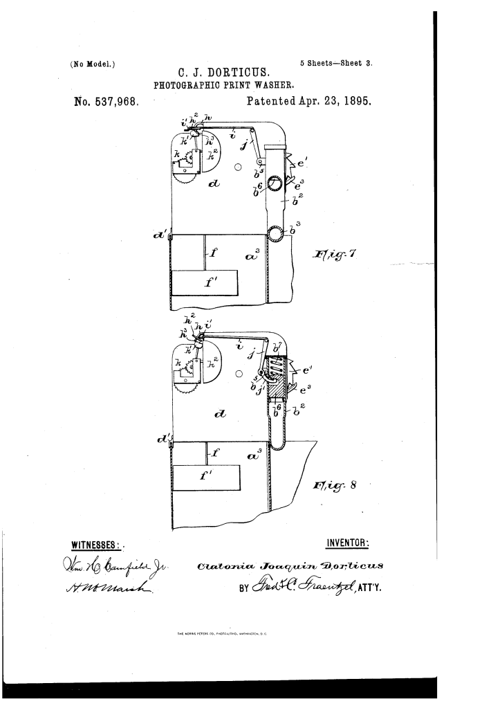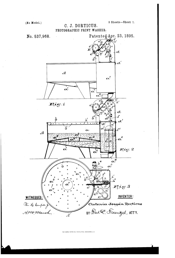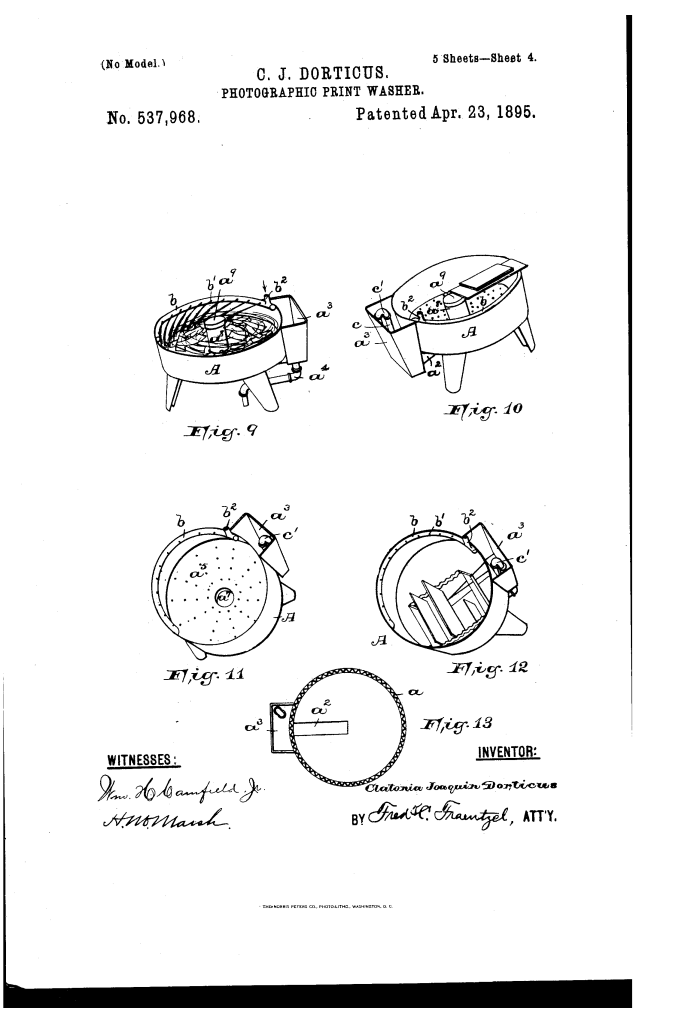 The patent by Clatonia Joaquin Dorticus of Newton, New Jersey, describes an improved Photographic Print Washer (Patent No. 537,968, 1895). The invention’s primary objective is to efficiently and uniformly wash photographic prints and negatives to eliminate sodium hyposulfite (hypo) and other chemicals, which, if left, would ruin the photos’ permanency or luster. The design focuses on solving several problems of existing washers, including prints sticking, tearing, or being unnecessarily over-washed.