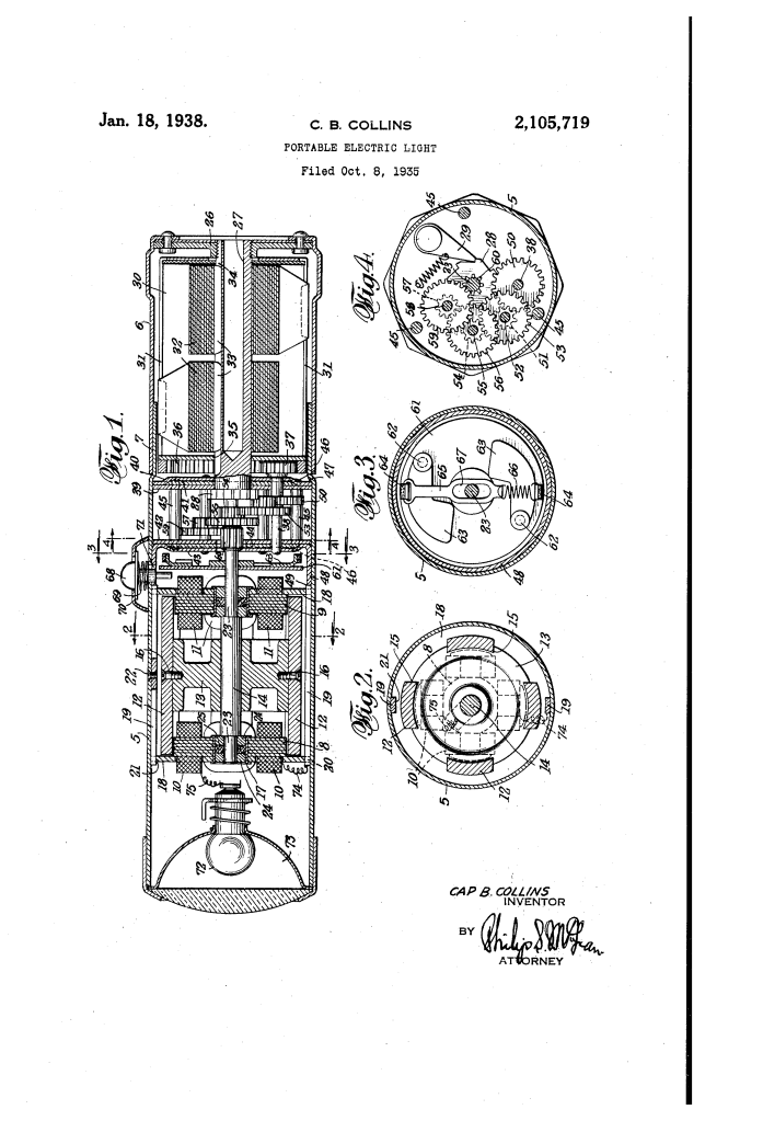 The patent by Cap B. Collins of Washington, D.C., describes a Portable Electric Light (Patent No. 2,105,735), granted on January 18, 1938. This invention is a self-powering flashlight that operates without chemical batteries, instead utilizing a mechanical spring motor and a compact internal generator. By winding the handle section of the casing, the user stores energy in spiral springs which, when released, drive a high-speed gear train to spin magnets and generate a continuous electric current for the lamp.