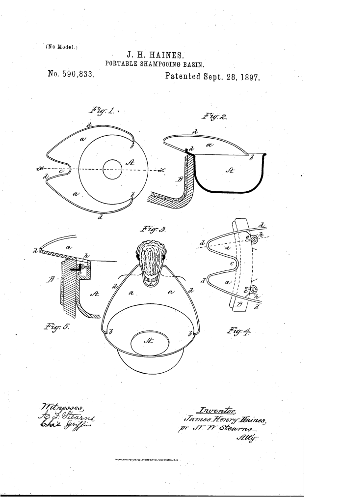 The patent by James Henry Haines of Tampa, Florida, describes a Portable Shampooing-Basin (Patent No. 590,883, 1897). The primary purpose is to simplify and obviate the inconvenience of the traditional shampooing process in a hair-dresser’s shop by avoiding the fixed basin and allowing the shampooing to be done while the customer remains seated in the chair.