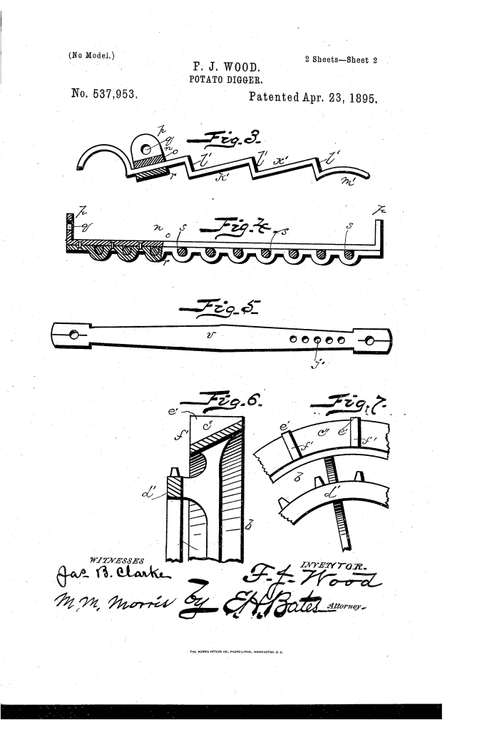 Francis J. Wood’s 1895 patent is part of the ongoing mechanization of farming, specifically addressing the intensive labor required for potato harvesting.
