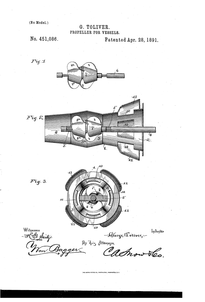 George Toliver’s patent for a “Propeller for Vessels,” No. 451,086, describes an innovative screw propeller designed to maximize efficiency and speed. Patented on April 28, 1891, the invention’s key features were a double-frustum-shaped hub with two sets of spiral propeller blades.