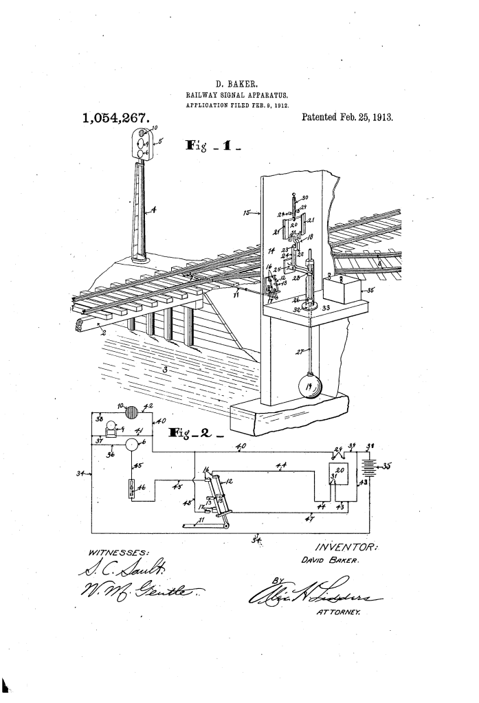 The patent by David Baker of Los Angeles, California, describes a Railway Signal Apparatus (Patent No. 1,053,555, 1913). This invention is a unified safety system designed for railways, specifically at locations where a track passes over a bridge. It integrates two critical safety checks into a single signaling unit: the physical condition of the river/stream level (to detect flood risks to the bridge) and the status of a nearby siding switch (to prevent derailments).