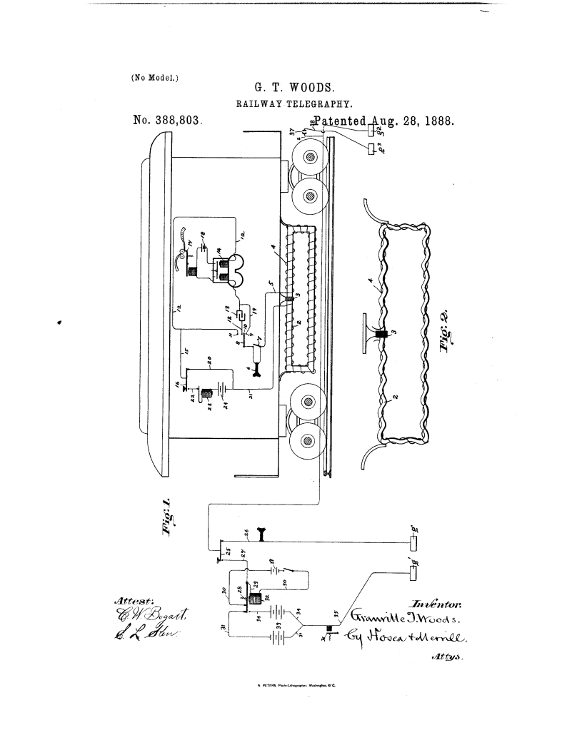 The patent, US388803A, granted to Granville T. Woods of Cincinnati, Ohio, on August 28, 1888, is for a significant improvement in induction telegraphy for railways. Induction telegraphy allows for communication between a moving train and a stationary station without a physical wire connection.