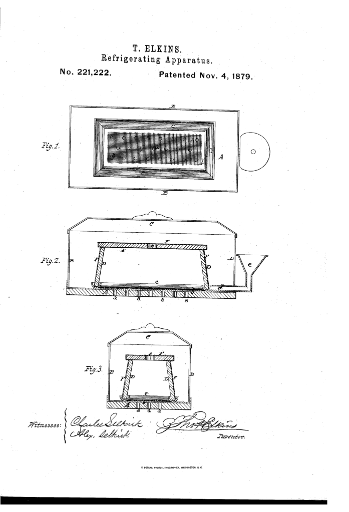 Refrigerating apparatus – Thomas Elkins – 1879 – Patent: US221222A
