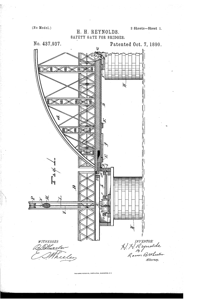 The patent, US437937A, granted to Humphrey H. Reynolds of Detroit, Michigan, on October 7, 1890, is for an improved safety gate system for drawbridges. The invention is designed to automatically lower a safety gate on the bridge’s approach before the draw-section opens and to automatically raise it as the draw-section closes. This system improves the safety of both pedestrians and vehicles.