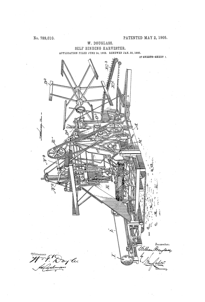 The patent by W. Douglass describes a Self-Binding Harvester (Patent No. 789,010, 1905). This is an extremely complex, large-scale agricultural machine designed to cut, gather, bundle, and bind grain in a continuous operation. The key focus is on the intricate mechanical systems required to automate the binding process reliably and adjustably.