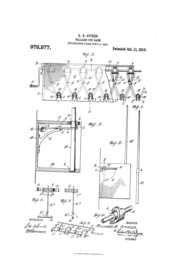 The patent by Richard B. Spikes of Albuquerque, New Mexico, describes a Billiard-Cue Rack (Patent No. 963,834, 1910). The invention provides a way for pool hall owners to simultaneously lock all cues in a rack, preventing unauthorized “practice” that causes excessive wear and tear on expensive billiard balls, cues, and table cloth. The design allows the proprietor to unlock all cues with a single key when a paying customer is ready to play.
