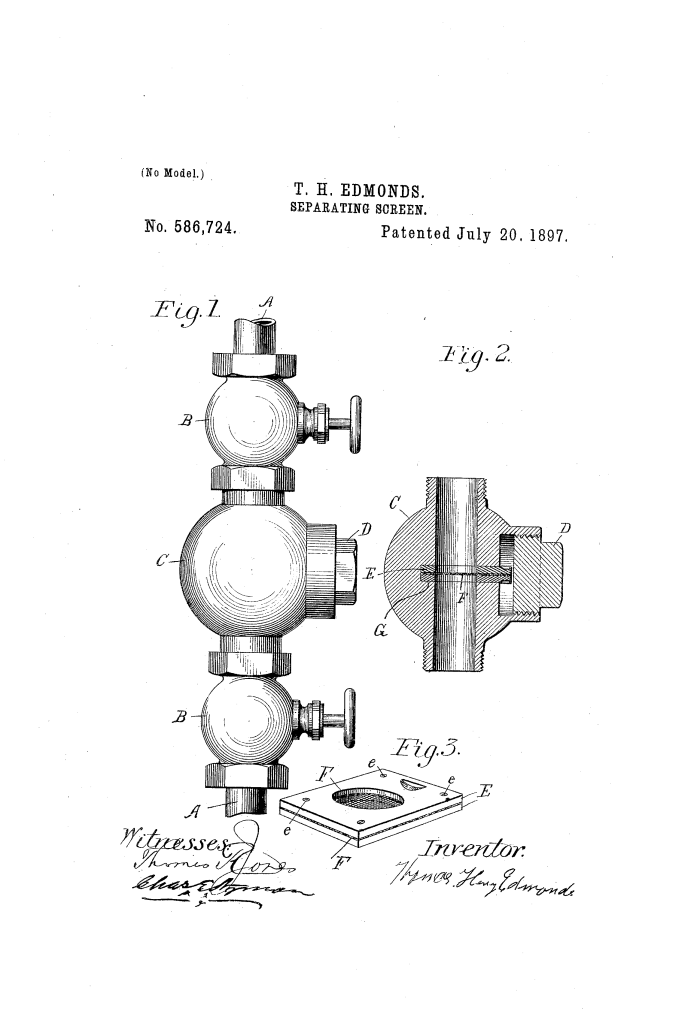The patent by Thomas Henry Edmonds of Washington, D.C., describes a new and useful Separating-Screen (Patent No. 586,724, 1897) designed to be inserted in water-supply pipes. The invention’s object is to provide a durable and easily serviceable screen capable of withstanding the high pressure of water, preventing lint, scale, shell, or any foreign substance from passing through the pipes. It is specifically intended for use with automatic valve-regulators.