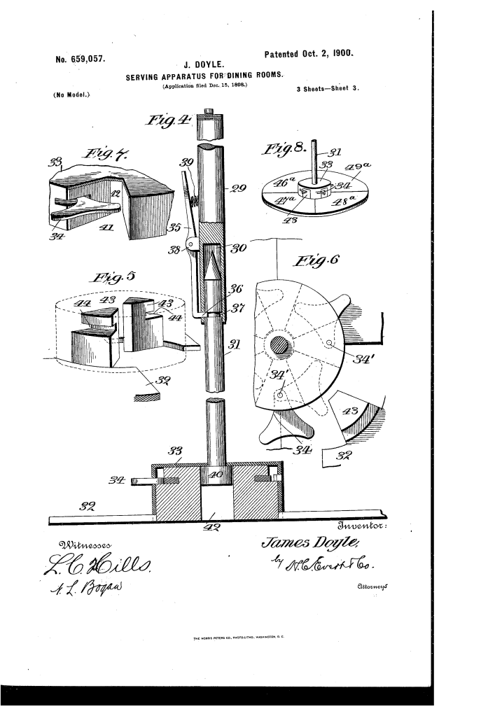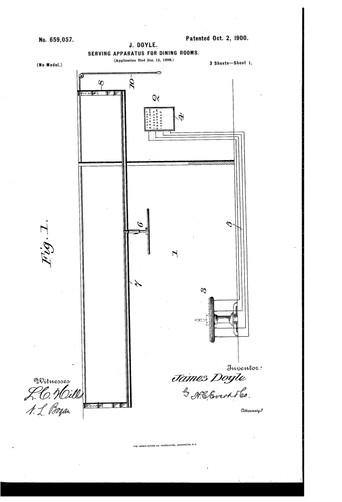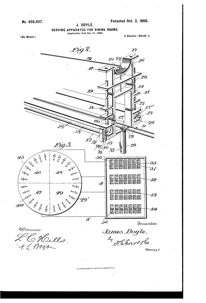 The patent by James Doyle of Pittsburg, Pennsylvania, describes a Serving Apparatus for Dining-Rooms (Patent No. 659,057, 1900). The primary object of the invention is to dispense with the usual waiters and provide an automated system where a guest can indicate the food desired to a chef and receive the ordered food via an improved carrier.