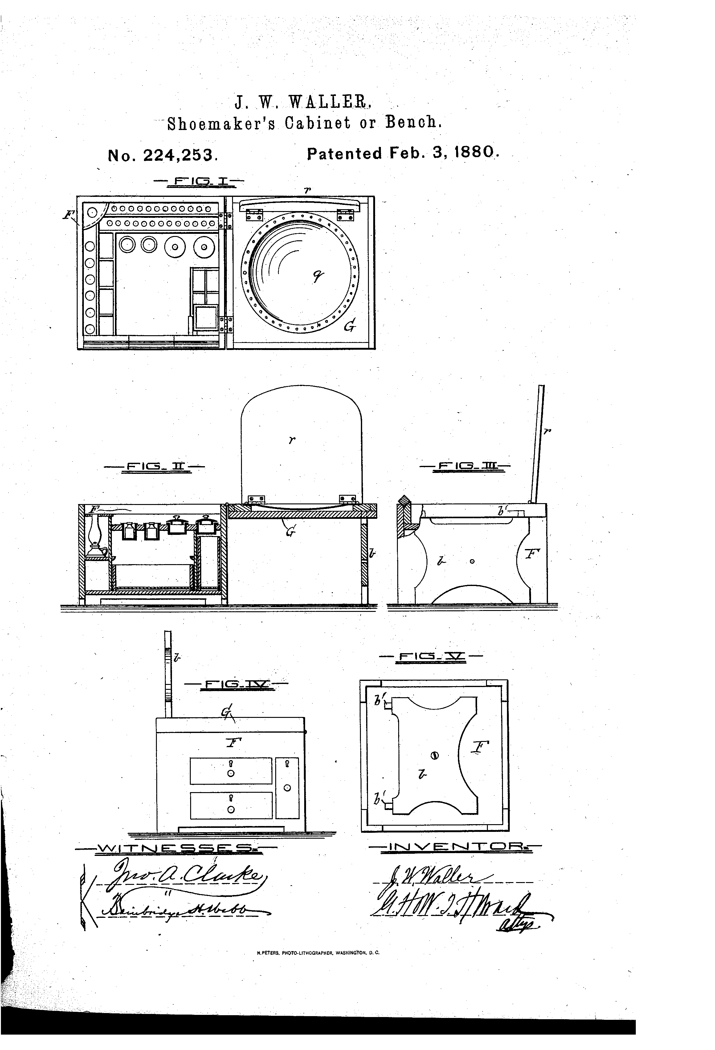 The patent by Joseph W. Waller of Baltimore, Maryland, describes a Shoemakers’ Cabinet or Bench (Patent No. 224,253, 1880). The invention relates to a combined cabinet and seat designed to organize the various tools and materials used by a shoemaker (or cobbler) into a compact, portable, and efficient workstation.