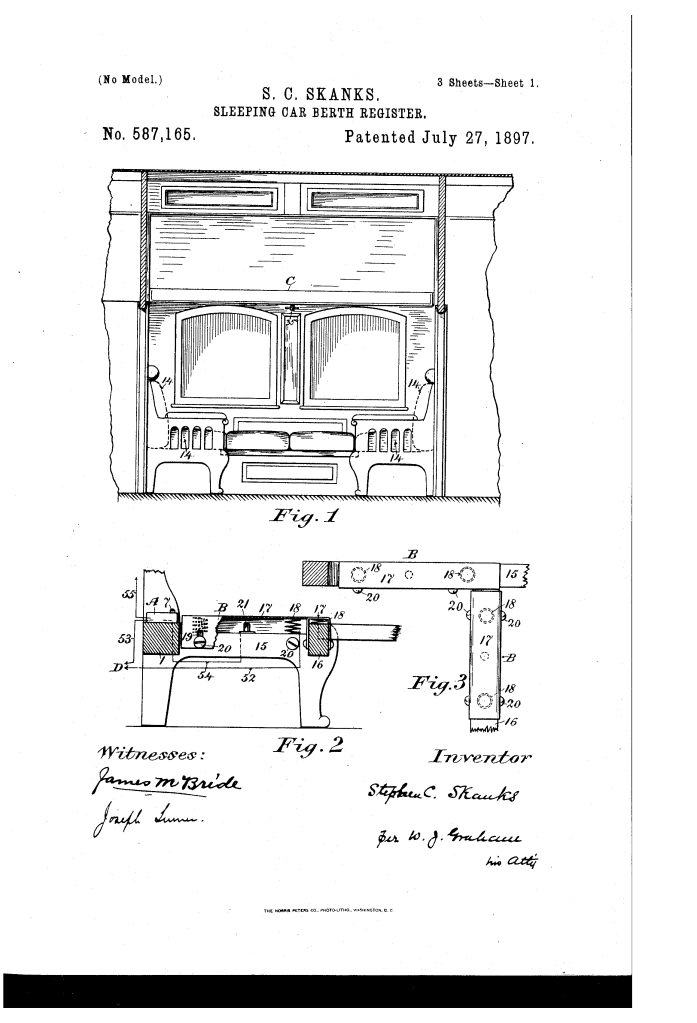 The patent by Stephen Chambers Skanks of Toronto, Canada, describes an Electric Sleeping-Car-Berth Register (Patent No. 587,165, 1897). The invention’s object is to provide an electrical system to positively and reliably register or indicate the use or occupation of a sleeping-car berth each night.