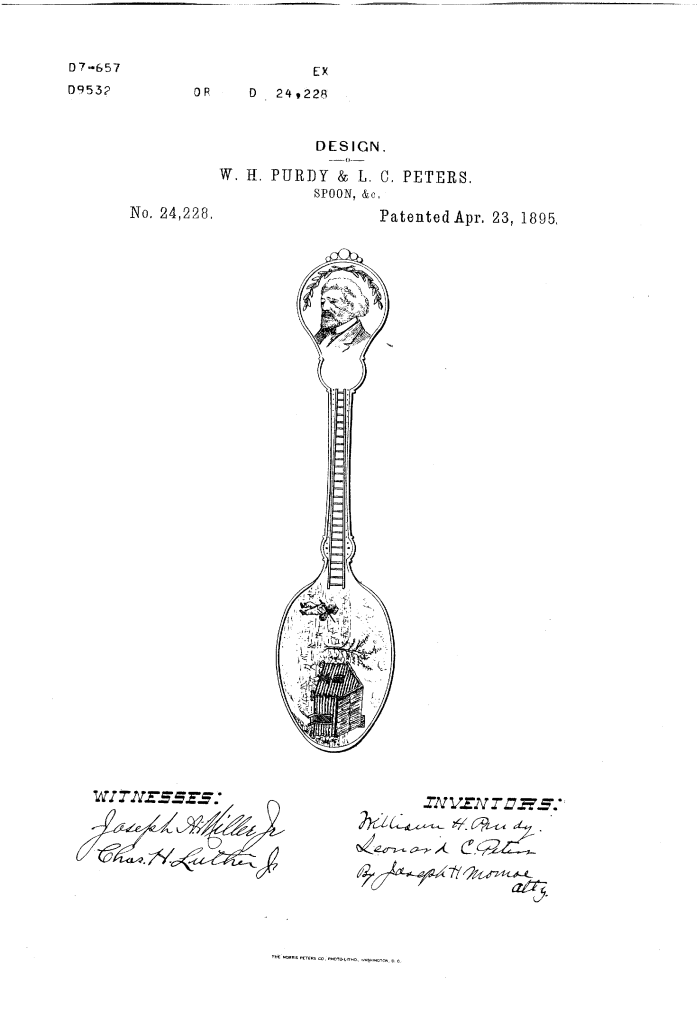 The patent document is a Design Patent (No. 24,228) granted to William H. Purdy and Leonard C. Peters of Providence, Rhode Island, on April 23, 1895, for a new and original Design for a Spoon and other Similar Articles.