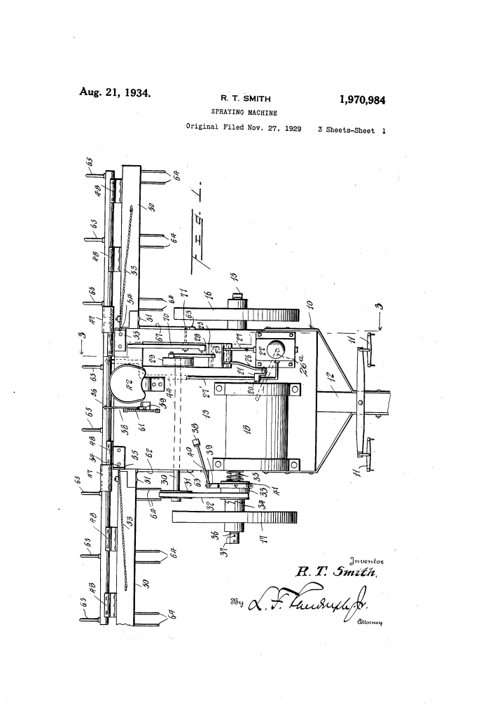 The patent by Robert T. Smith of Eufaula, Oklahoma, describes a Spraying Machine (Patent No. 1,970,984). This invention is a highly adjustable, horse-drawn mechanical applicator designed to deliver insecticidal solutions to row crops, such as cotton and potatoes, with a specific focus on reaching the vulnerable under-surfaces of foliage.