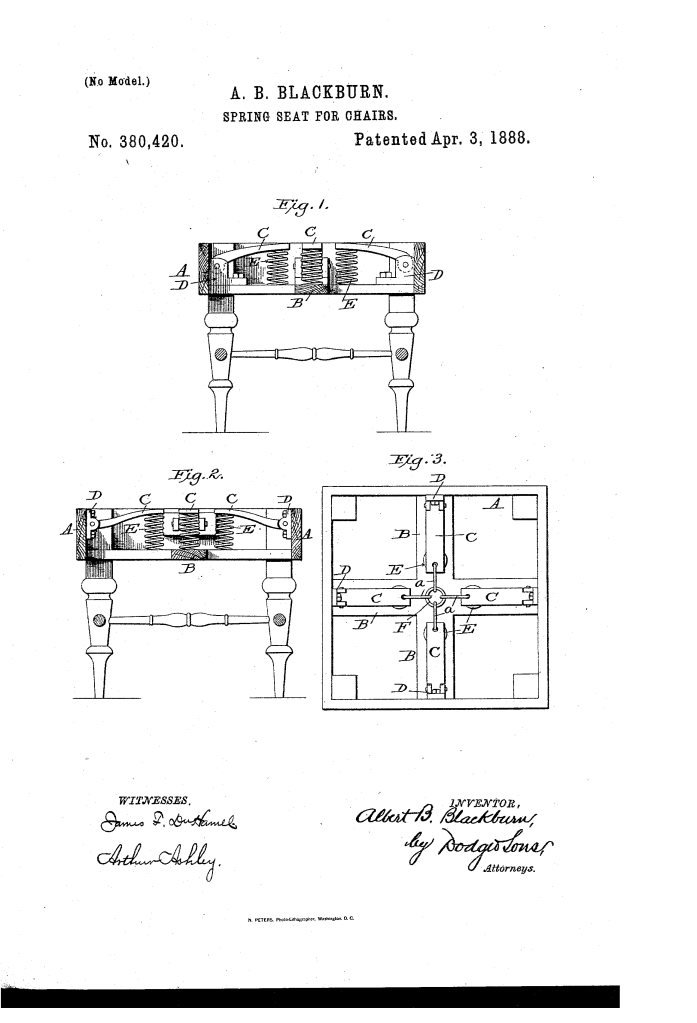 The patent, US380420A, granted to Albert B. Blackburn of Springfield, Ohio on April 3, 1888, is for an innovative “spring seat” for chairs, sofas, and similar furniture. Blackburn’s design focuses on a modular and improved spring system that enhances comfort and simplifies manufacturing and repair.