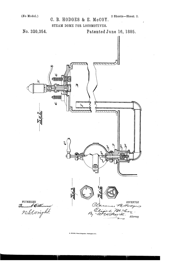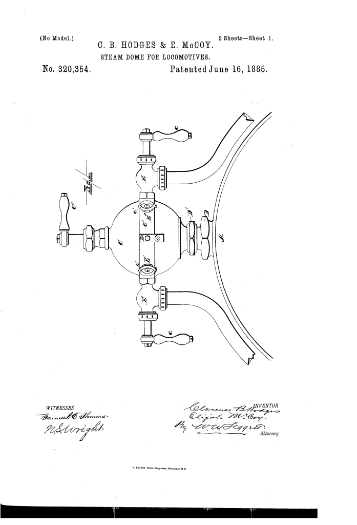 Clarence B. Hodges and Elijah McCoy’s patent for a “Steam-Dome for Locomotives”, No. 320,354, describes an innovative way to improve the safety and efficiency of locomotive boilers. Patented on June 16, 1885, the invention’s primary purpose was to consolidate the numerous steam connections that were typically tapped directly into a boiler’s shell.