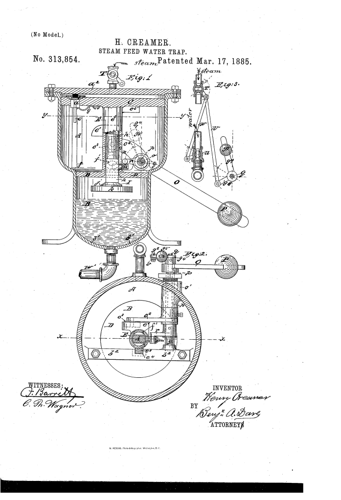 Henry Creamer received U.S. Patent No. 313,854 for a Steam Feed-Water Trap on March 17, 1885. This invention was designed for steam power systems, specifically to automatically return condensed steam (condensate) from heating systems or other steam-using apparatus back to the boiler. This process, known as “trapping,” is crucial for improving the efficiency of steam systems, reducing fuel consumption, and preventing boiler damage.