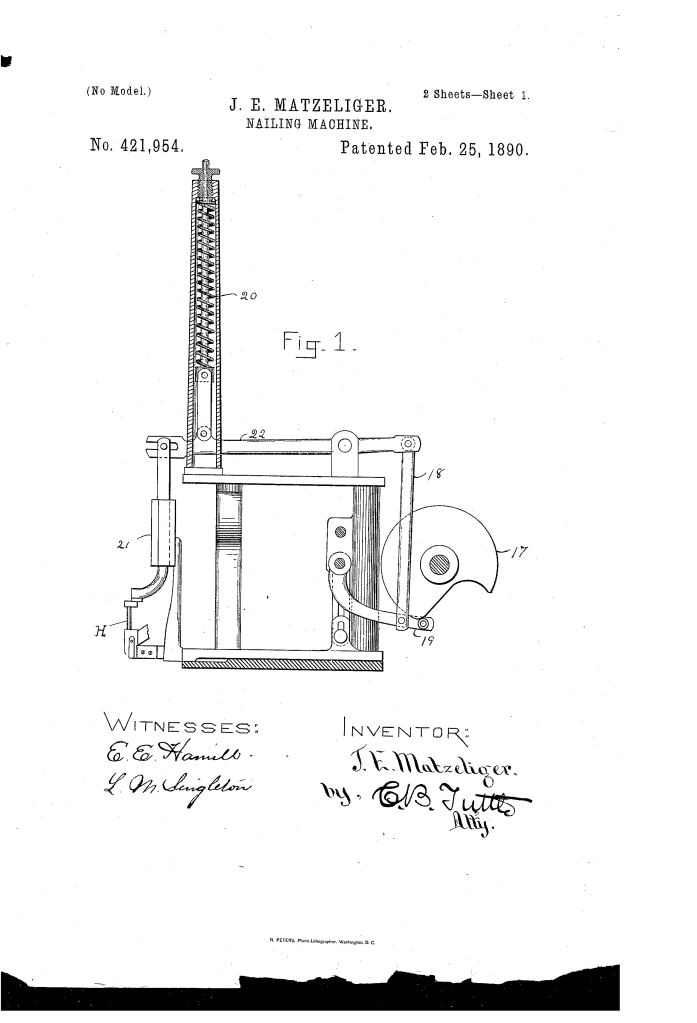 Jan Matzeliger’s patent for a “Nailing Machine” was a critical component of his larger, more famous invention: the lasting machine. This patent, No. 421,954, granted on February 25, 1890, specifically describes the mechanism for separating, distributing, and driving tacks and nails.