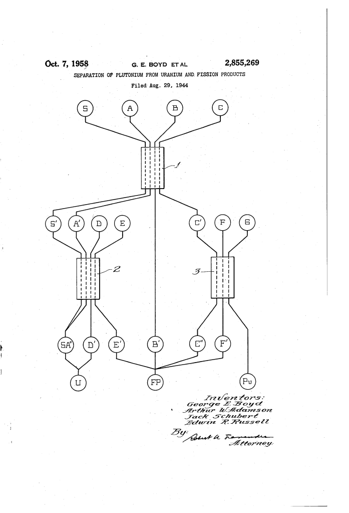 U.S. Patent No. 2,855,269, granted on October 7, 1958, to George E. Boyd, Arthur W. Adamson, Jack Schubert, and Edwin R. Russell, describes a groundbreaking chemical process for isolating plutonium (Pu) from neutron-irradiated uranium. Filed during the height of the Manhattan Project in 1944, this patent was eventually assigned to the U.S. Atomic Energy Commission.