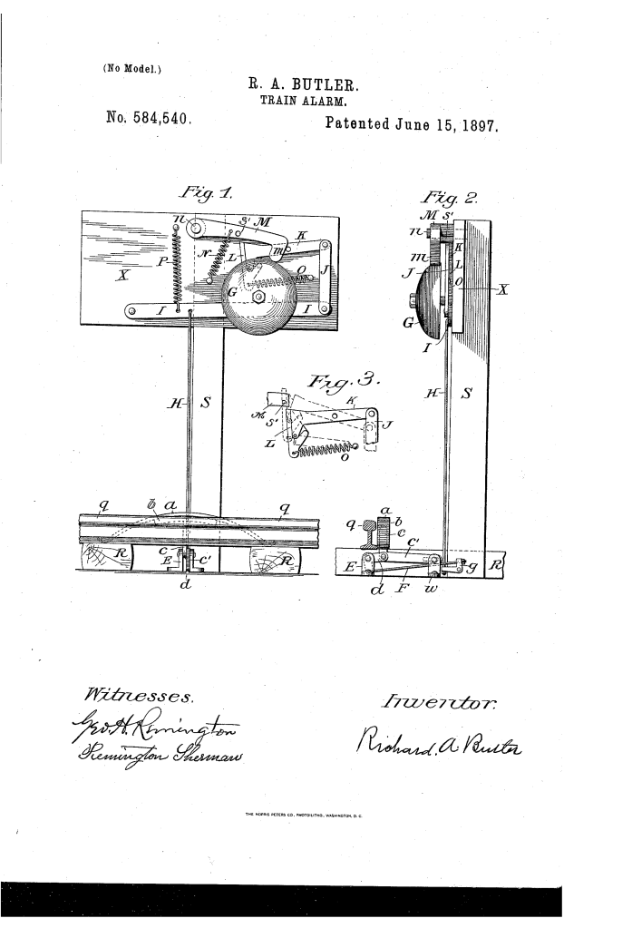 Richard A. Butler was an inventor contributing to railway safety devices in the late 19th century. His invention addresses a specific and dangerous operational hazard of the time: the risk of trainmen (who had to walk or stand on top of freight cars) being struck by low-hanging structures. Butler’s system provided a simple, track-actuated warning mechanism.