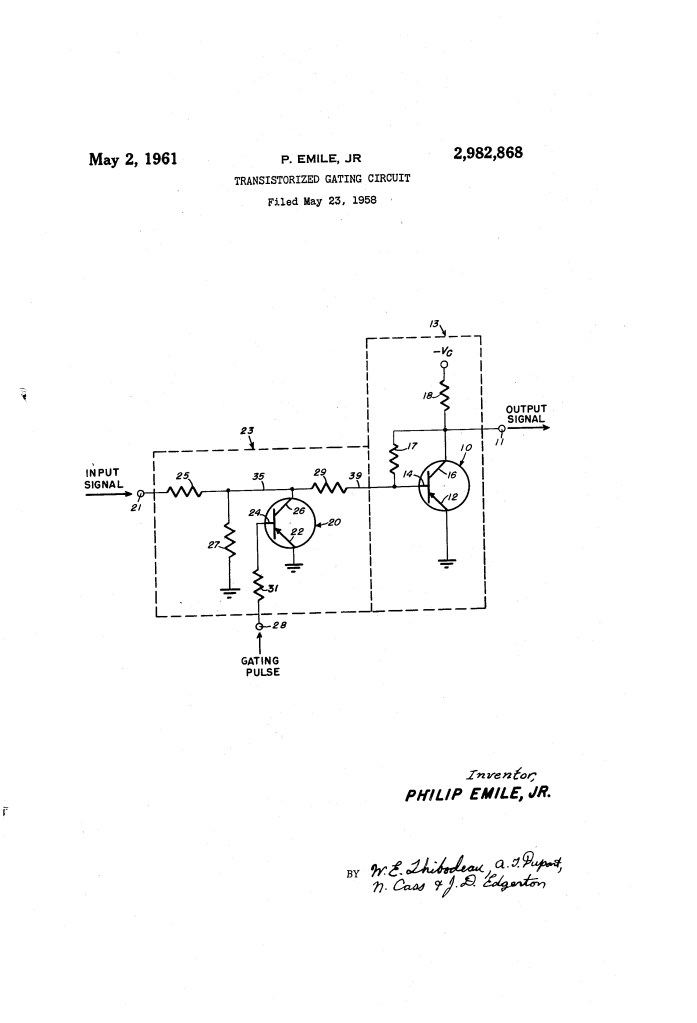 U.S. Patent No. 2,972,726, granted on May 2, 1961, to Philip Emile, Jr., describes a high-precision electronic “gate” designed for the U.S. Army. In the early days of transistor technology, electronic gates—circuits that allow or block a signal based on a control pulse—often suffered from distortion or a “pedestal” effect (an unwanted shift in the DC voltage level when the gate opened or closed).