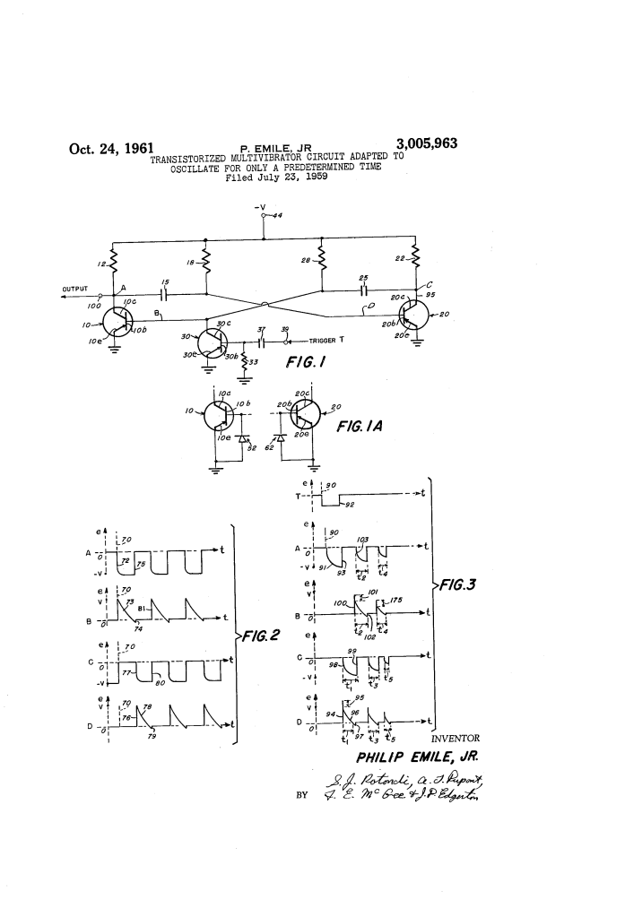 U.S. Patent No. 3,005,953, granted on October 24, 1961, to Philip Emile, Jr., introduces a specialized transistorized circuit designed for high-speed computing and timing. Unlike a standard free-running multivibrator that oscillates indefinitely, this circuit is engineered to produce a specific, predetermined number of pulses in response to a single trigger signal before automatically shutting itself off.