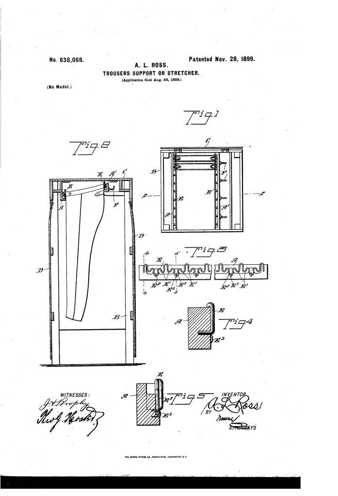 - The supports (A, A’) are preferably L-shaped in cross-section where the bars are attached, featuring a cut-out portion to “readily admit the buttons of the trousers.”