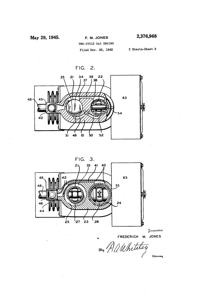 In this 1945 patent, Jones re-engineered the standard two-cycle (two-stroke) engine to solve its most persistent flaws: poor lubrication, inefficient fuel charging, and excessive vibration. His solution was a “cross-charging” twin-cylinder design that used one piston to act as a supercharger for the other, all while sharing a single, simplified crankcase.